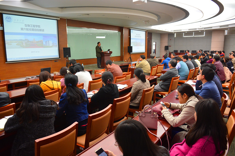 许正宏院长从战略定位、主要任务、影响提升、难题破解四个方面通报了《2017-2019生物工程学院任期目标责任书》内容,就本科教学、研究生培养、科学研究、学科建设、师资队伍、党建思政、影响提升七个方面的重点指标进行了认真解读,学院将以任期目标责任制为重要抓手,进一步聚焦“双一流”建设,践行“三优一实 ”,通过优化学科布局、优化资源配置、优化内部环境、夯实学科基础 ,不断推进内涵发展,促进“重大项目、重大成果、高水平文章”的产出,不断提升影响力,努力再攀“生工新高”。