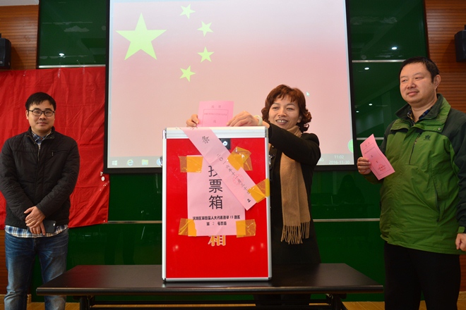 上午9时,选举大会正式开始,大会由生物工程学院党委副书记、副院长王珏主持。按照选举程序,宣读完本选区正式代表候选人和《无锡市滨湖区第四届人民代表大会代表选举办法(草案)》后,监票员、计票员、选举工作人员经举手表决通过后,到主席台履行职责。监票员、计票员清点核实到会选民人数和代票数并报告大会主持人,监票员检查票箱,工作人员领取选票,有条不紊地向选民发放选票。主持人就填写选票的方法和应该注意的问题作说明,指引选民在写票处填写选票。选民们在选票上的代表候选人名字上方慎重画上圈,在监票人的注视下庄严投入票箱。