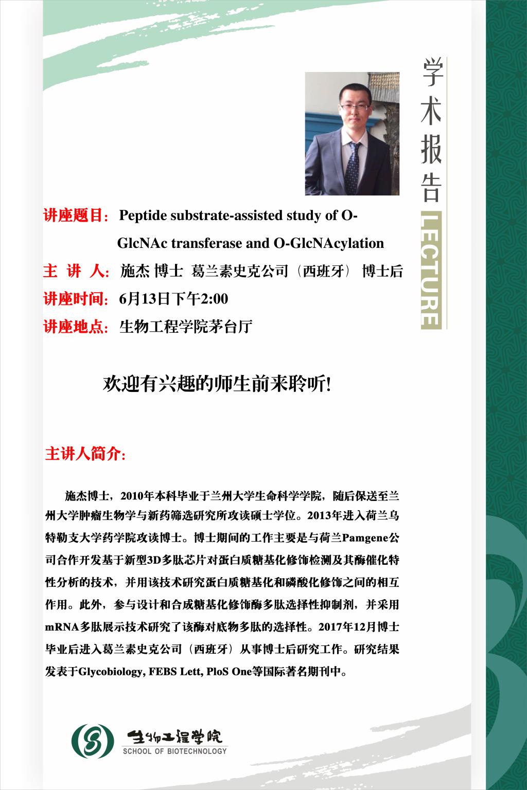 6月13日学术报告:Peptide substrate-assisted study of O-GlcNAc transferase and O-GlcNAcylation