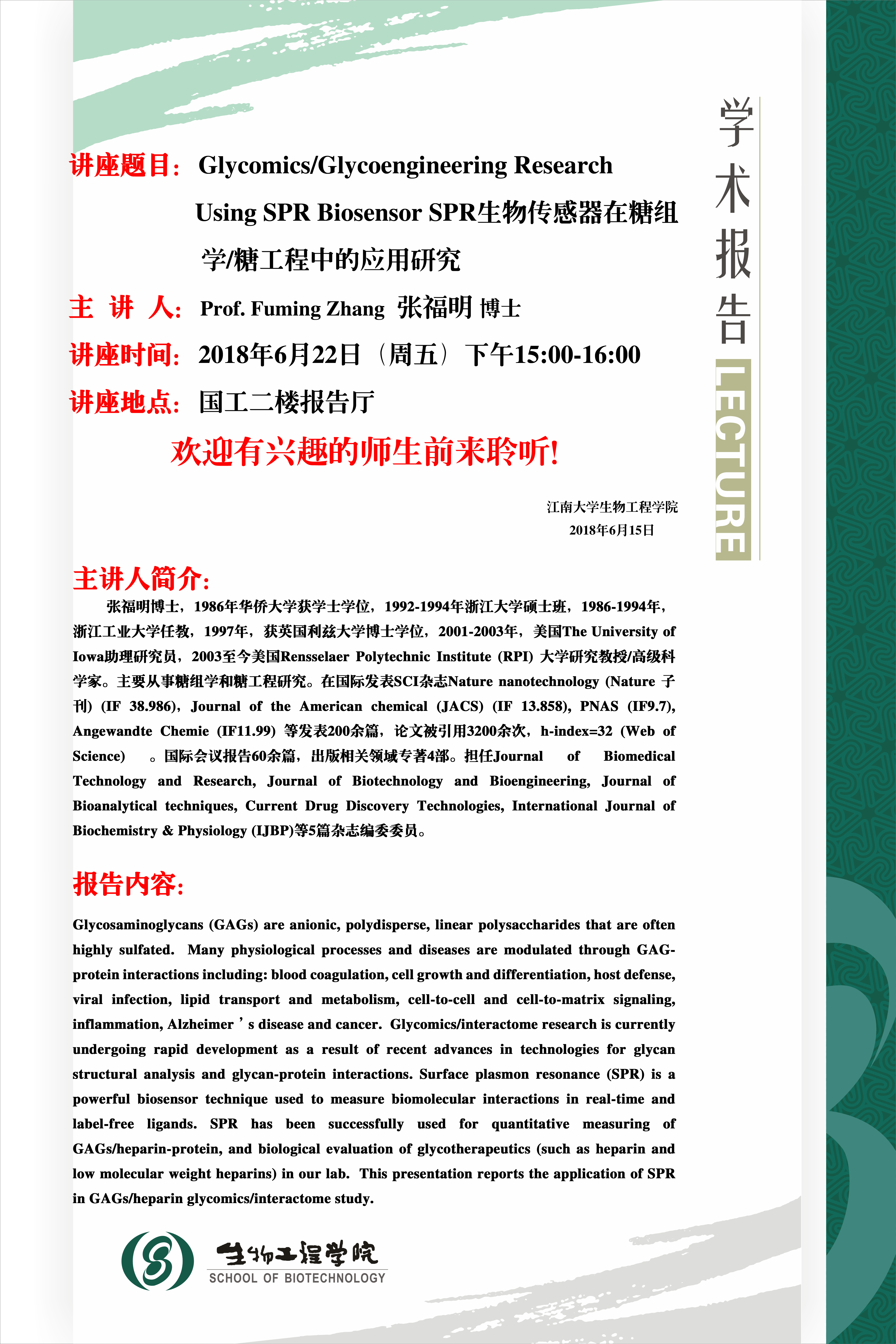 6月22日学术报告:Glycomics/Glycoengineering Research Using SPR Biosensor SPR生物传感器在糖组学/糖工程中的应用研究