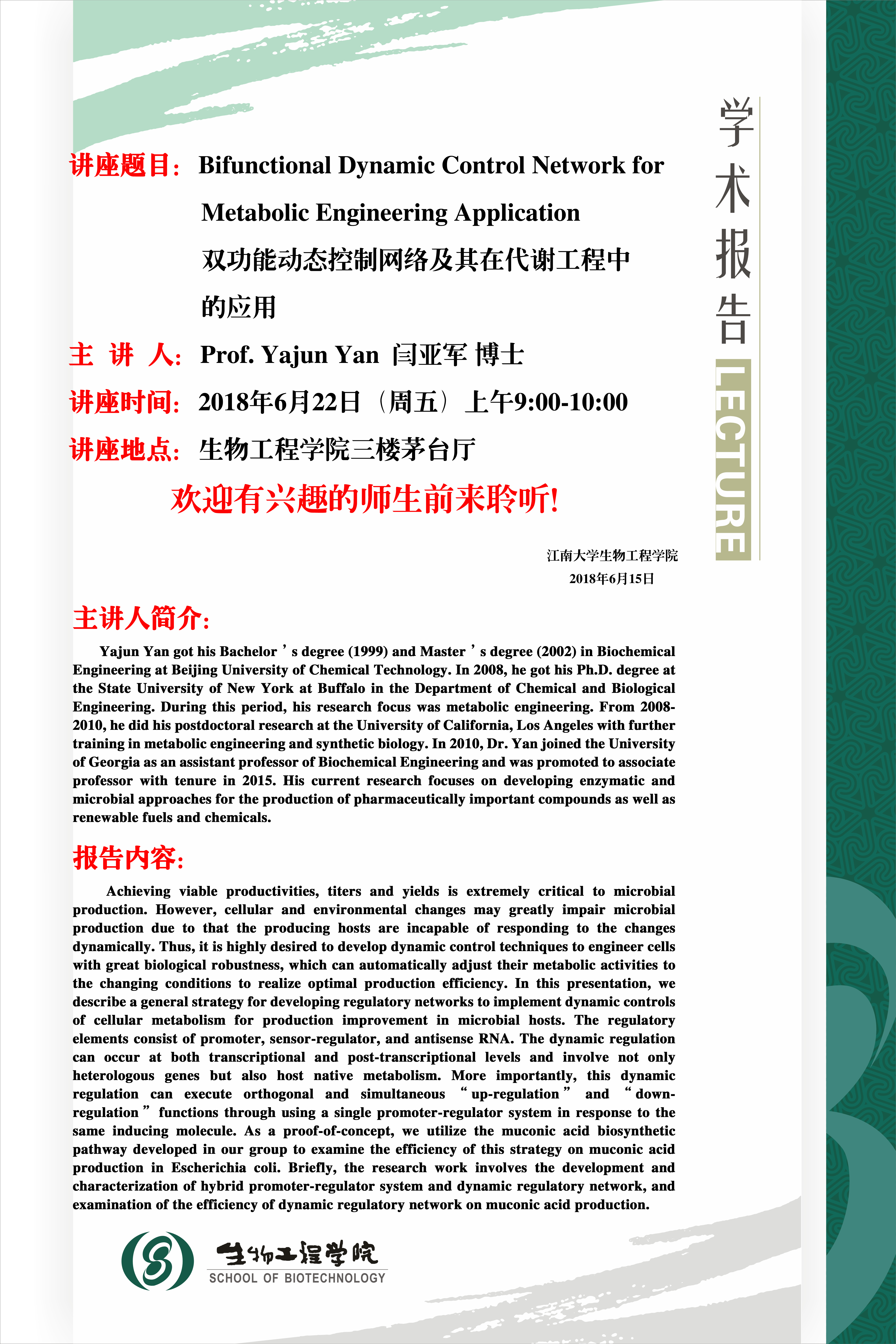 6月22日学术报告:Bifunctional Dynamic Control Network for Metabolic Engineering Application