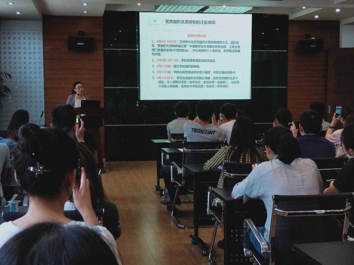 杨柳老师首先介绍了什么是党员组织关系介绍信,说明了组织关系介绍信的意义和重要性,引起各位党员同学的重视。其次,会议介绍了2018年的新变化,毕业生党员组织关系的转接除开具纸质党员关系介绍信外,还需同时进行通过全国党员管理信息系统进行组织关系网上转接。最后杨柳老师详细说明党员组织关系转移类型及办理过程中的注意事项,要求党员同学严肃认真慎重的处理个人党员组织关系转接问题。