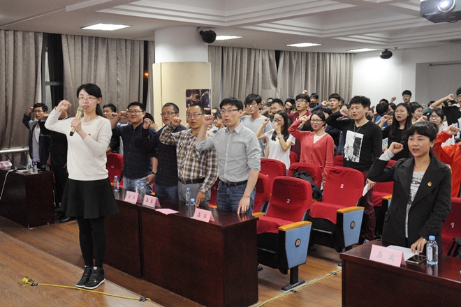 葛玲老师带领与会团员重温入团誓词,熟悉又庄严的誓词提醒着在场的每一位团员:铭记团员使命,不忘入团初心。团员青年纷纷表示要将入团誓词牢记心中,履行好职责,真正做一名合格的团员,为人民为社会为祖国做出贡献。